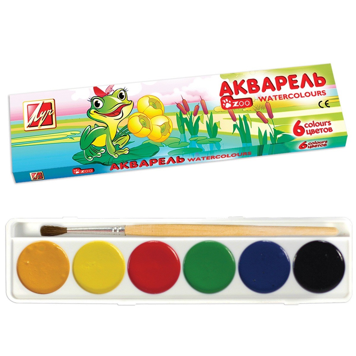 Луч Краски акварельные медовые, 6 цветов с кисточкой