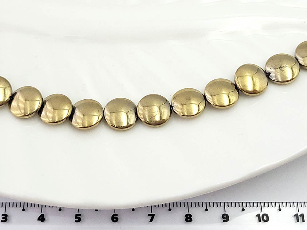 Гематит золото, таблетка круглая выпуклая 10*2 мм, 20 см/нить