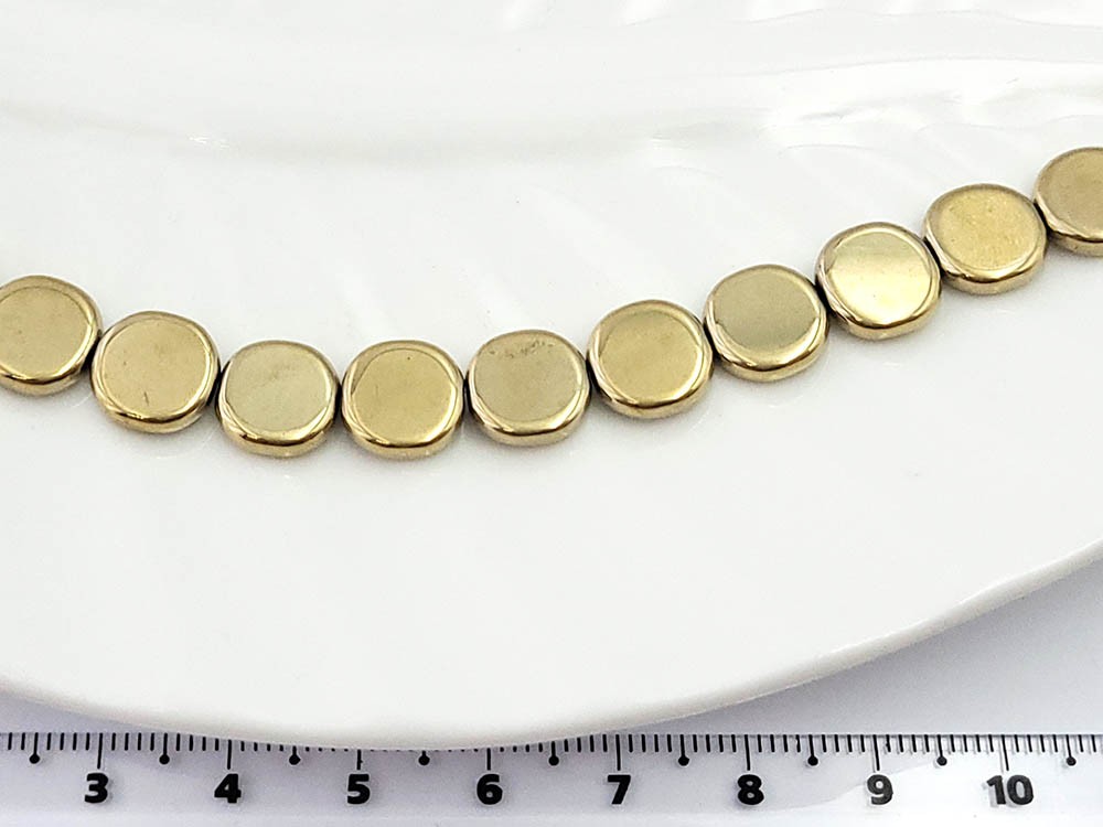 Гематит золото, таблетка плоская круглая 10*2 мм, 20 см/нить