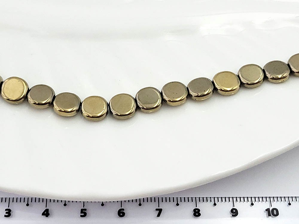 Гематит золото, таблетка плоская круглая 8*2 мм, 20 см/нить