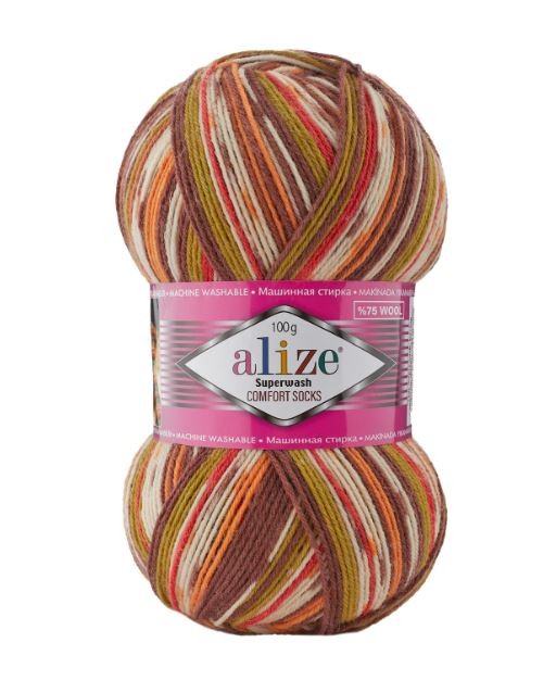 Главная / Всё для творчества и хобби / Вязание / Пряжа / Alize / Superwash comfort socks (75% шерсть, 25% полиамид, 100г/420м) / Пряжа ALIZE 7709 superwash, коричневый/оранжевый/зеленый/белый
